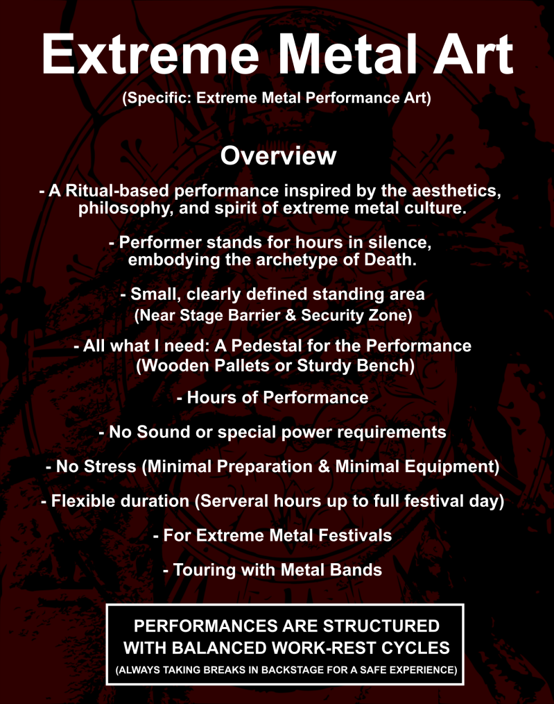 I grew up with Metal and it inspired me to create something in the Scene. This Performance teaches discipline and self-control. Only a few people have been able to see this figure in public but now it exists within the extreme metal scene, where isolation and darkness are understood. I created The Metal Statue to honor Metal and the Scene. Metal means Art. Metal means Freedom. Freedom of Expression.